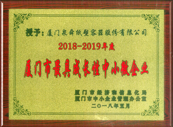 近日,经过评审方严格的初审、再审、终审后,泉舜纸塑容器再度获评为由厦门经济发展局和厦门市中小企业协会联合评选出的2018-2019年度厦门市最具成长性企业。这是公司继2009年以来第八次获评此称号。
