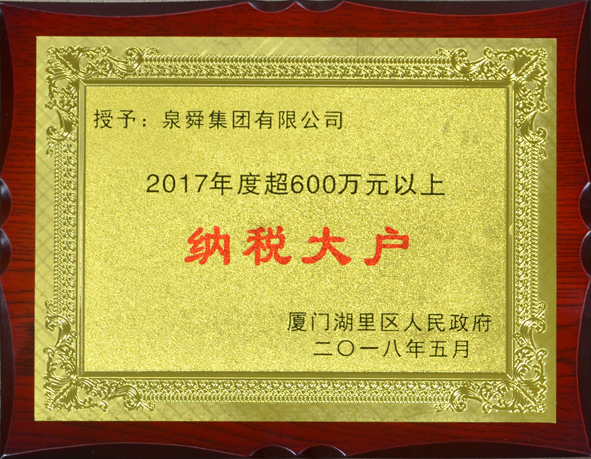 近日,集团荣获厦门市湖里区“2017年度纳税大户”称号。