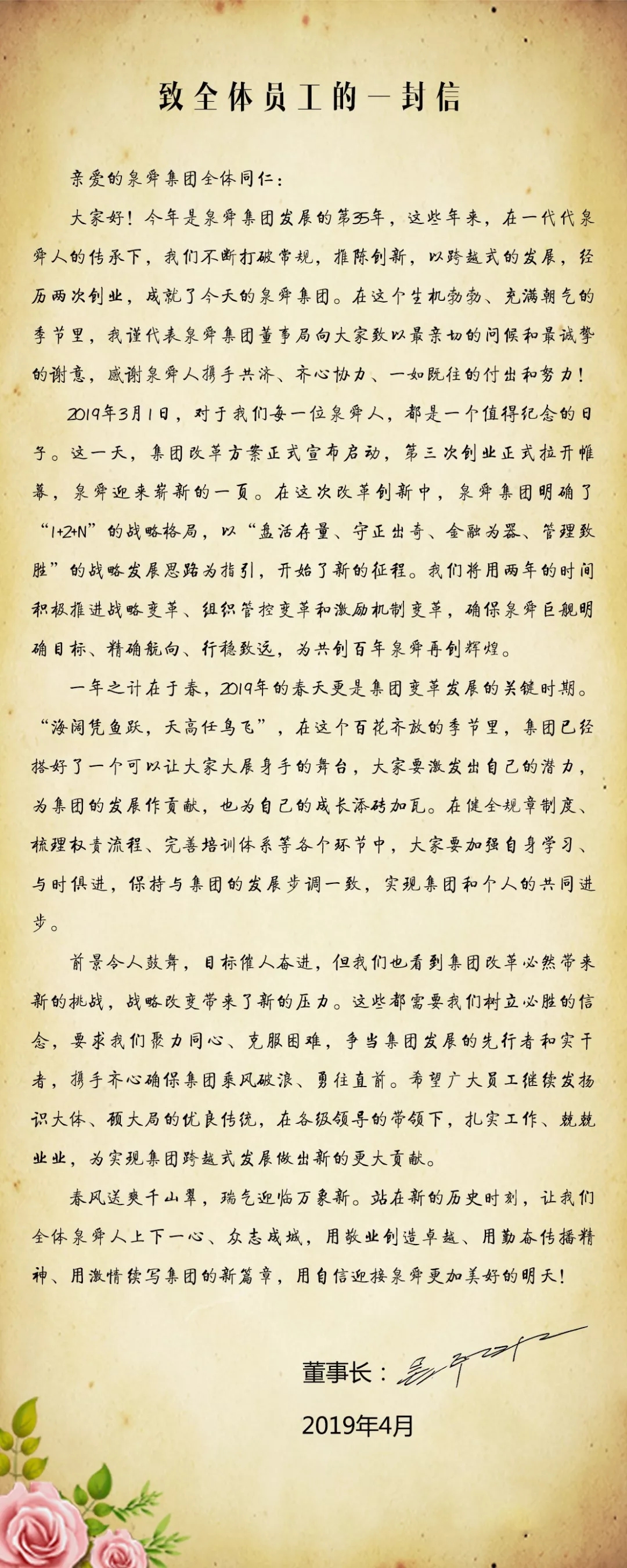 奋斗成就辉煌,劳动创造未来——五一劳动节之际,集团吴泉水董事长致全体同仁的一封信