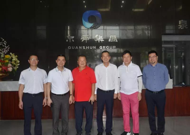 6月6日,广田集团董事长叶远西先生(左二)、恒荣集团董事长赖荣火先生(右二)、李武现老师(左三)等一行莅临泉舜参观考察,泉舜集团董事长吴泉水(右三)亲自陪同,大家就企业发展、文化建设等方面进行了深入交流。