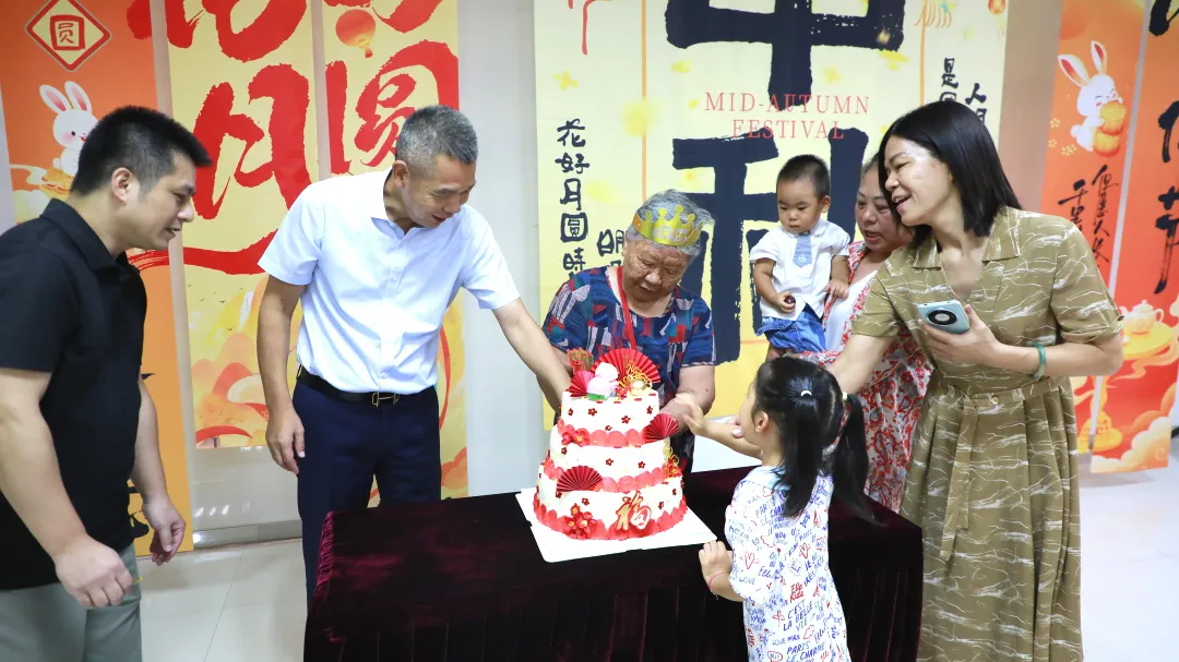 当晚最动人的环节,莫过于一场藏在团圆里的“小惊喜”——为吴泉水董事长的母亲庆贺生日。在这阖家欢腾的日子里,全场泉舜家人自发响起雷鸣般的掌声,化作最诚挚的生日礼赞;工作人员手捧点缀着烛光的精美蛋糕缓缓上前,暖黄的烛火映亮了老人家慈祥的笑容。吴董搀扶着母亲走到台前,熟悉又欢快的生日歌在会场悠扬响起,全体人员起身齐声高唱,将“福寿安康、笑口常开”的祝福,融进每一个音符里,也让这份“孝亲敬老”的温暖,感染了在场的每一个人。