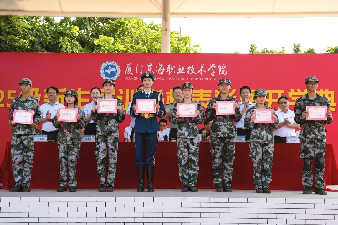近日,厦门东海职业技术学院隆重举行2025级新生军训考核表彰暨开学典礼。学校党政领导、同安区人民武装部上校部长洪利华,以及校属各单位负责人参加了活动。仪式由常务副校长宋艳春主持。