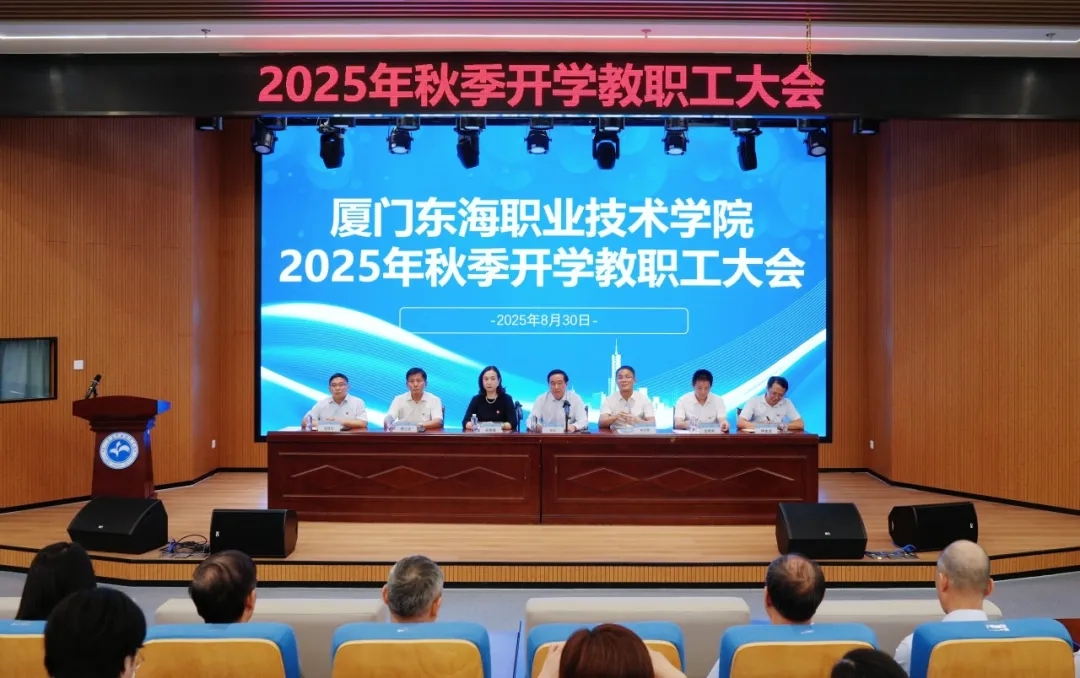 8月30日上午,厦门东海职业技术学院2025年秋季开学教职工大会在学校五号楼报告厅顺利召开。会议由钟华校长主持,学校党政领导班子及全体教职员工参加了会议。常务副校长宋艳春作秋季开学工作报告。她通过一串串数字,从党建引领、依法治校、师资建设、教学科研、产教融合、社会服务、学生管理、招生就业等多个维度,全面、生动地回顾了厦门东海职业技术学院2025年上半年的工作成果,并明确了学校下一阶段的重点工作:一是“十五五”规划的编制;二是办学条件达标工程的验收;三是2024年度民办学校年检存在问题的整改以及2025年度年检的准备工作。接下来,学校将持续强化党建引领:开展主题教育,组织地方文化考察,提升党务人员能力;优化治理体系:完善决策机制,推进制度规范化建设;提升师资水平:加大高层次人才引进力度,健全师德师风长效机制;深化教学改革:推进校级教改项目,承办市级职业技能竞赛新赛项;推动科研创新:整合资源,鼓励跨院部联合申报,培育高水平项目;拓展校企合作:争创产业学院,构建“立足海西、辐射国际”的合作体系;保障校园安全:定期排查隐患,推进文明校园建设。希望全体东海人牢记“为党育人、为国育才”的使命,以更加饱满的热情、更加务实的作风,凝心聚力、开拓创新,共同书写厦门东海职业技术学院高质量发展的新篇章! 随后,学校党委书记林志聪传达了2025年全省高校领导干部办学治校能力专题研讨班会议精神,强调要持续以习近平新时代中国特色社会主义思想为指引,深入学习贯彻党的二十大精神,坚决落实立德树人的根本任务,坚守职业教育的定位,聚焦党的人才培养,科学谋划发展重点任务,切实提升育人实效。钟华校长在总结发言中明确强调,学校须坚定不移贯彻党的教育方针,将 “为党育人、为国育才” 使命落到实处。以提升教育质量为核心,深化教学改革,筑牢校园安全防线,强化学生管理,推动各项工作落实落细,切实转化育人成效。钟华校长表示,学校要以高度的政治自觉扛起育人责任,精准把握当前形势,结合学校实际,紧密跟踪区域产业发展与升级的趋势,在职业教育的赛道上主动求变、积极作为,奋力开辟特色发展新路径、塑造核心竞争新优势,全力攀登高质量办学新高峰!会议在热烈的掌声中顺利落幕。此次大会统一了思想、明确了目标、鼓舞了士气,为新学期工作按下“加速键”。相信全体教职工将以更加坚定的信念、更加务实的行动,携手谱写学校高质量发展的新篇章,为服务区域经济社会发展、培养新时代技术技能人才作出更大贡献!