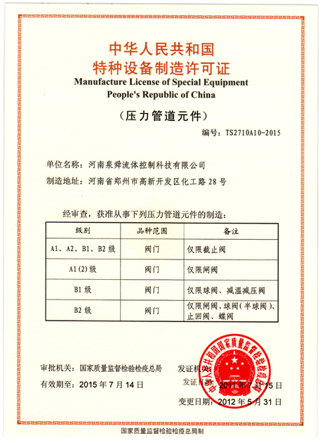 因为牵涉到生产和民生安全,我国历来对特种设备行业的资质审核十分严格。此次审核通过的增项内容包括减温减压阀、止回阀和蝶阀三个品种。增项许可证进入网络电子公告系统后,快速提升了公司资质的可信度,极大地方便了各子公司和市场销售人员在全国各地开展业务。这不仅表明了泉舜流控在科研水平方面的提高,也展示了公司生产实力的扩张,同时,意味着“泉舜”牌流控设备增强了竞争力,有能力在销售市场上占有更多的份额。