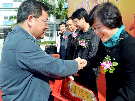 海沧投资区管委会主任、区长吴南翔(左)为集团颁发支持红十字事业“爱心单位”奖牌