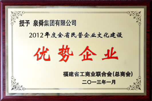 继荣获“2009年—2011年度福建省企业文化建设示范单位”之后,近日,福建省工商联发布《福建省工商业联合会关于认定2012年度全省民营企业文化建设优势企业的决定》(闽联〔2013〕19号),泉舜集团作为52家民营企业之一被认定为“2012年度全省民营企业文化建设优势企业”,再获殊荣。