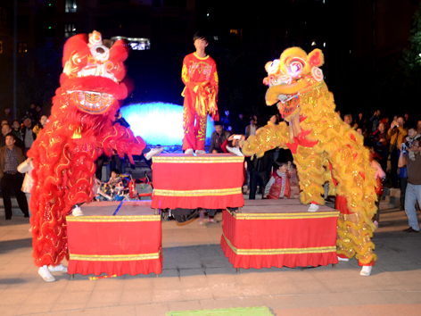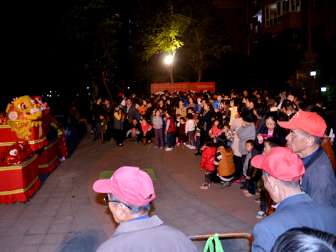 及至七点半之时,本次元宵活动的重头戏——舞狮表演正式开场。两只舞狮一黄一红,先是在锣鼓声中环绕小区各栋楼层一圈,为小区业主祈福,接下来便用精彩的表演让现场的观众一饱眼福。你看那黄狮子,左摇右晃,憨态可掬,可一转眼便蹦上高台,前扑有猛虎下山之势,后退则气定神闲沉稳如山;红狮子也不遑多让,空中翻腾矫捷如龙,地下行走迅猛如风,舞狮客们的各种杂技动作精彩夺目,让场下观众纷纷拍手叫好。甚至在告一段落之时,业主们都依旧沉浸在这种热闹的气氛中,连连说到:“怎么这么快就结束了,还没看够呢。”