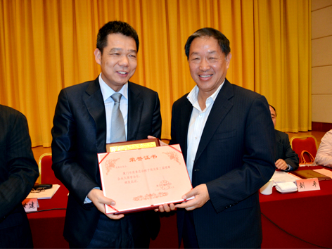 厦门市副市长潘世建(右)亲自为吴董颁发证书