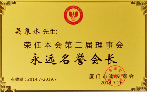 近期,鉴于吴泉水董事长近几年来对厦门市南安商会作出的贡献,厦门市南安商会第二届理事会特别授予集团吴泉水董事长“永远名誉会长”职务。 据悉,厦门市南安商会聚集了一大批在厦的南安籍企业及优秀企业家,投资覆盖近30多个行业,成员一度逾千人,遍布于房地产业、建材装修、医药食品、机械设备、加工制造、水暖阀门、电子科技、文化创意、医疗器械、酒店餐饮、石材石油、商贸服饰、外贸化工、烟酒茶业、日用零批、资金及项目开发、法律、商标咨询及服务、教育培训、旅游服务、机动车服务系列等几十个经济领域。