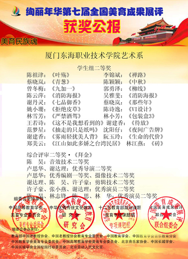 近日,由教育部中国高等教育学会、中国教育学会、十二五教育部规划课题组等单位主办的“绚丽年华•第七届全国美育成果展评”系列活动评选结果揭晓。艺术系斩获多个奖项,其中包括了获得艺术美育教学模范系奖项、4个个人成果一等奖奖、教师组4个一等奖、学生组9个一等奖、22个二等奖等。