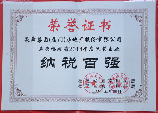 4月13日,福建省国税局、地税局联合召开2014年度纳税百强企业暨民营企业纳税百强发布会。副省长郑晓松到会讲话,并为“双百强”企业代表受匾,泉舜集团(厦门)房地产股份有限公司成功入围,荣获福建省“2014年度民营企业纳税百强”称号。