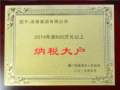 日前,厦门市湖里区政府对179家2014年纳税先进企业进行表彰,泉舜集团榜上有名,获2014年度600万元以上“纳税大户”称号。