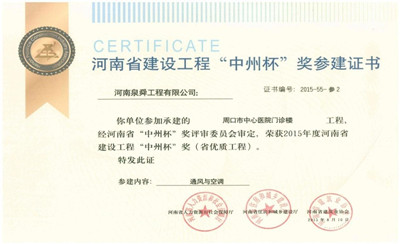 近日,泉舜工程参加承建的周口市中心医院门诊楼工程荣获2015年度河南省建设工程“中州杯”奖(省优质工程)。“中州杯”奖由河南省建筑业协会组织评选,是河南省省建设行业工程质量的最高荣誉奖。2013年度,泉舜工程周口市中心医院中央空调系统项目QC小组申报的《利用QC方法提高玻镁风管制作安装质量成果》QC成果,曾被评为中国有色金属建筑行业部级工程建设优秀QC小组成果二等奖。