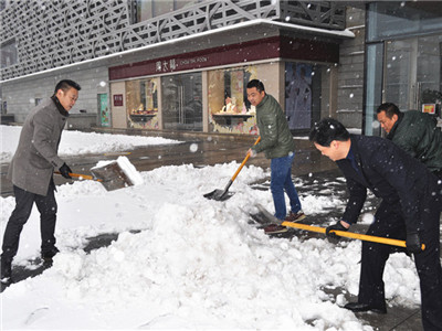 大雪带来美丽景色的同时,也给前来泉舜购物中心逛街的顾客带来诸多不便。24日一早,洛阳泉舜商业有限公司全体员工在总经理王威的带领下,来到北广场扫雪除冰。大家不顾大雪扑面、道路湿滑,团结协作清扫积雪、铲去碎冰,保障顾客出行安全。经过1个小时的努力,泉舜购物南北广场和主干道恢复畅通,以干净整洁之姿迎接第一批顾客的到来。