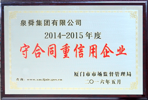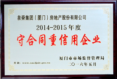 近日,泉舜集团及厦门地产被厦门市工商行政管理局评定为2014-2015年度“厦门市守合同重信用企业”。据悉,集团及厦门地产已连续十余年获此殊荣。