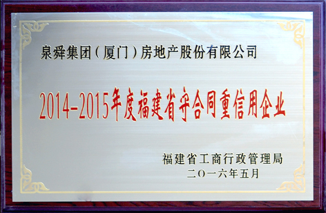 近日,福建省工商行政管理局颁发了2014~2015年度“守合同重信用”企业奖牌及证书,泉舜集团厦门地产再获此项殊荣,这也是厦门地产连续多年获得福建省和厦门市“守合同重信用”荣誉称号。近年来,厦门地产公司不断健全合同评审制度,规范经营行为,提高诚实守信的法律与道德水平。此项荣誉的再次获得,是对集团地产诚信守约经营行为的认可和鼓励,也是厦门地产一笔宝贵的无形资产,将为打造地产品牌、树立企业形象奠定坚实基础。