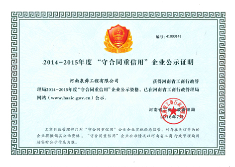 继荣获全国2012—2013年度“守合同重信用企业”之后,近日,泉舜工程连续荣登由国家工商行政管理总局和河南省工商行政管理局公示的2014—2015年度“守合同重信用”企业榜。在国家工商行政管理总局和河南省工商行政管理局网站公示,并颁发了证书。