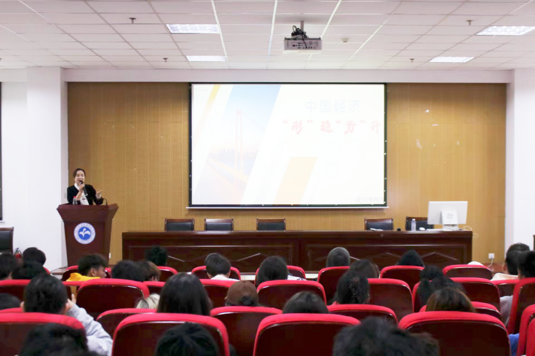 11月29日下午,我校在思源楼报告厅开设“形势与政策”思政课,学校党委副书记、常务副校长宋艳春同志走进思政课堂,以《中国经济“形”“稳”“势”升》为题为健康产业学院学生授课。学校全体辅导员、思想政治教学部老师到场听课观摩。宋艳春同志采用了翻转课堂的方式,结合丰富的实例,娓娓道来地从“回升向好态势明显”、“风险挑战不容忽视”、“中国经济底气何在”三个方面讲解中国经济的强大韧性,带领学生全面、辩证理解中国经济的“形” 与“势”,启发学生对当前就业形势的思考,客观地认识自身的专业发展前景。校领导带头讲授思想政治理论课程,为东海学院提升思政教育教学质量和水平作出了示范。