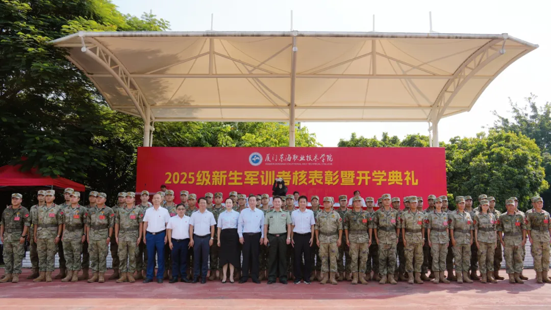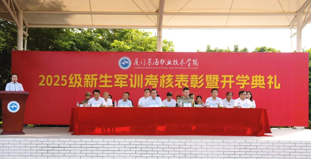 近日,厦门东海职业技术学院隆重举行2025级新生军训考核表彰暨开学典礼。学校党政领导、同安区人民武装部上校部长洪利华,以及校属各单位负责人参加了活动。仪式由常务副校长宋艳春主持。