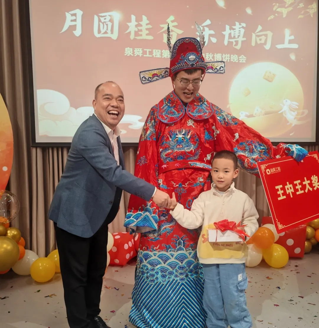 随着表演环节结束,备受期待的博饼活动在鸣锣中正式开启。清脆的骰子声与欢呼声此起彼伏,全体员工围桌而立,沉浸其中。在传统博饼规则中角逐“状元”“对堂”等奖项,最终,“王中王”的桂冠由王栖桐小朋友摘取,泉舜工程董事长吴水林为其颁奖,也为本场晚会画上完美的句号。